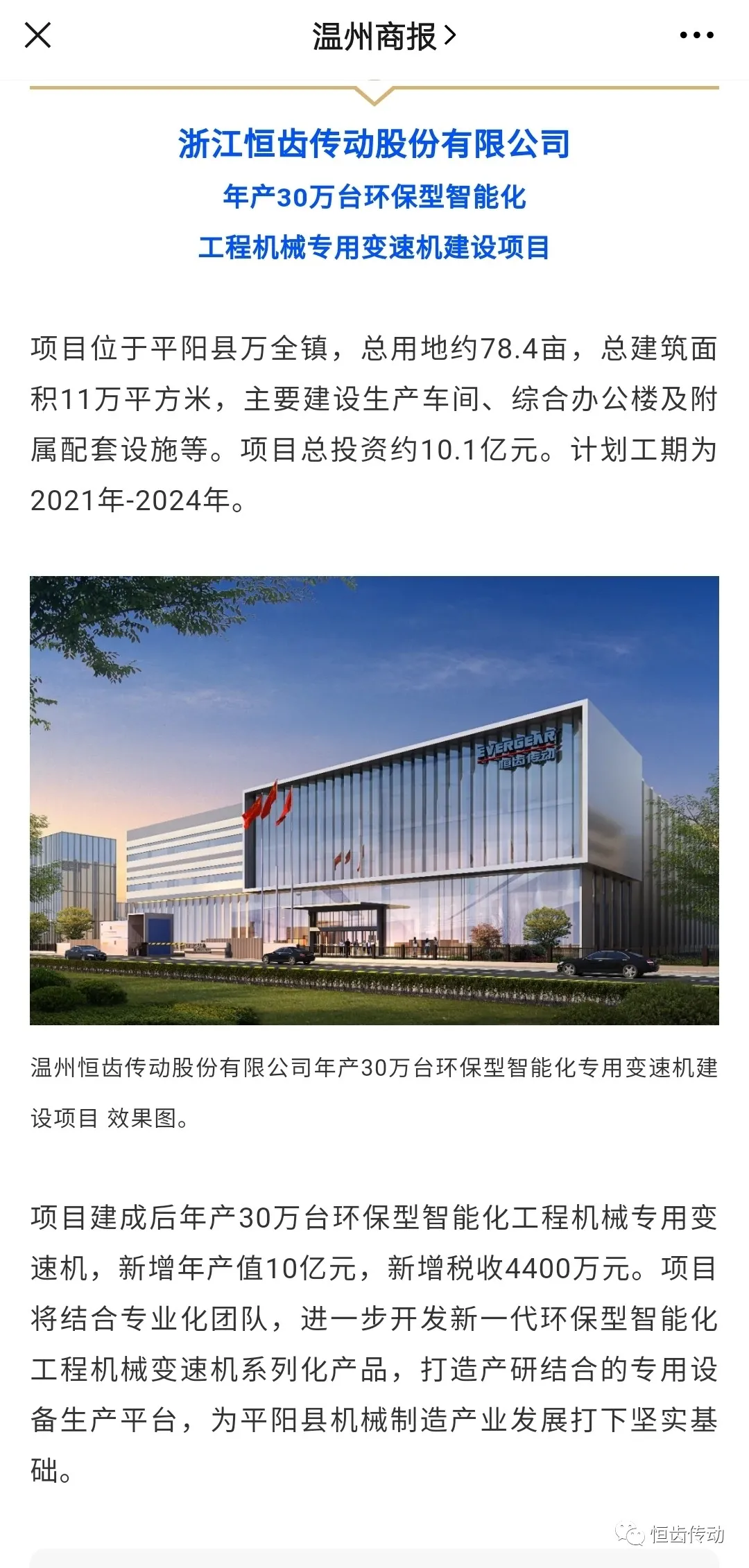 大動作|恒齒傳動年產30萬臺環保型智能化工程機械專用變速機建設項目